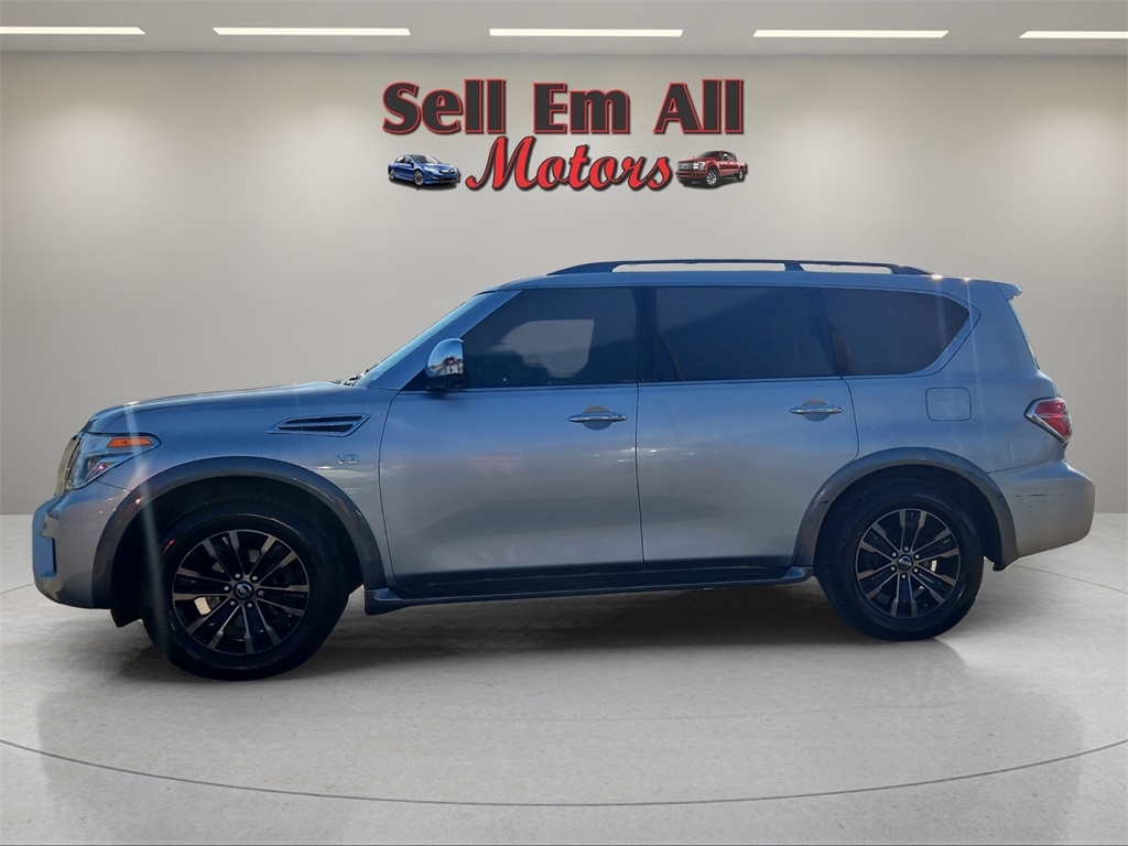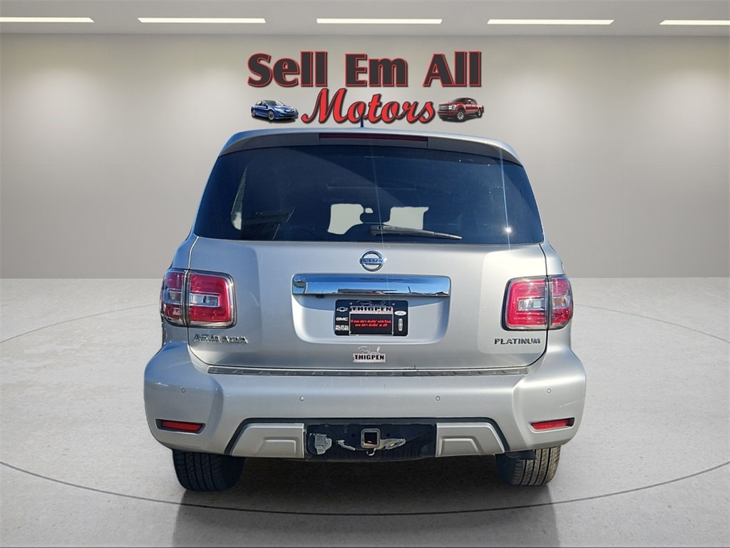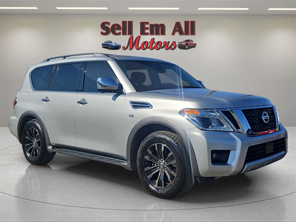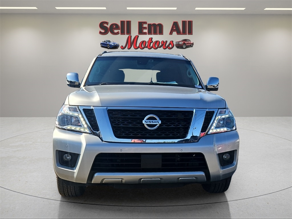 Sell Em All Motors in Vidlia is proud to offer this great 2017 Nissan Armada in Brilliant Silver This vehicle has passed our comprehensive inspection and comes with the following Captain Seat Package (Second Row Captain's Chairs and Second Row Center Console w/ Padded Armrest), Carpeted Floor Mats w/ Captain Seat Package, 13 Speakers, 2.937 Axle Ratio, 3rd row seats: split-bench, 4-Wheel Disc Brakes, A/V remote, ABS brakes, Air Conditioning, Alloy wheels, AM/FM radio: SiriusXM, Anti-whiplash front head restraints, Auto tilt-away steering wheel, Auto-dimming door mirrors, Auto-dimming Rear-View mirror, Auto-leveling suspension, Automatic temperature control, Brake assist, Bumpers: body-color, Cargo Area Protector, Cargo Net & First Aid Kit, CD player, Delay-off headlights, Driver door bin, Driver vanity mirror, Dual front impact airbags, Dual front side impact airbags, Electronic Stability Control, Four wheel independent suspension, Front anti-roll bar, Front Bucket Seats, Front Center Armrest, Front dual zone A/C, Front fog lights, Front reading lights, Fully automatic headlights, Garage door transmitter: HomeLink, Headphones, Heated & Cooled Front Bucket Seats, Heated door mirrors, Heated front seats, Heated rear seats, Heated steering wheel, Illuminated entry, Illuminated Kick Plates, Lane Departure Warning System, Leather Shift Knob, Leather-Appointed Seat Trim, Low tire pressure warning, Memory seat, Navigation System, Occupant sensing airbag, Outside temperature display, Overhead airbag, Overhead console, Panic alarm, Passenger door bin, Passenger vanity mirror, Power door mirrors, Power driver seat, Power Liftgate, Power moonroof, Power passenger seat, Power steering, Power windows, Radio data system, Radio: Bose AM/FM/SXM/CD/MP3 Audio System, Rain sensing wipers, Rear air conditioning, Rear anti-roll bar, Rear reading lights, Rear seat center armrest, Rear window defroster, Rear window wiper, Reclining 3rd row seat, Remote keyless entry, Roof rack: rails only, Roof Rail Cross Bars, Security system, Speed control, Speed-sensing steering, Speed-Sensitive Wipers, Split folding rear seat, Steering wheel mounted audio controls, Tachometer, Telescoping steering wheel, Tilt steering wheel, Traction control, Trip computer, Turn signal indicator mirrors, Variably intermittent wipers, Ventilated front seats, Voltmeter, and Wheels: 20" Machine-Faced Chrome w/Tinted CC;