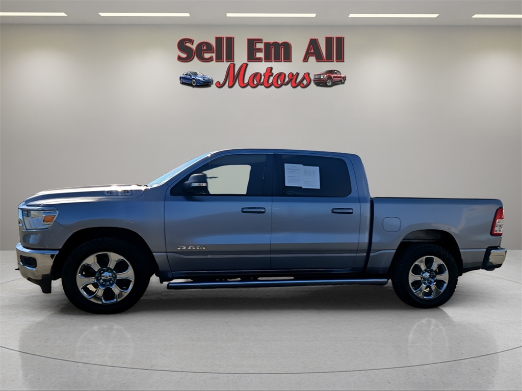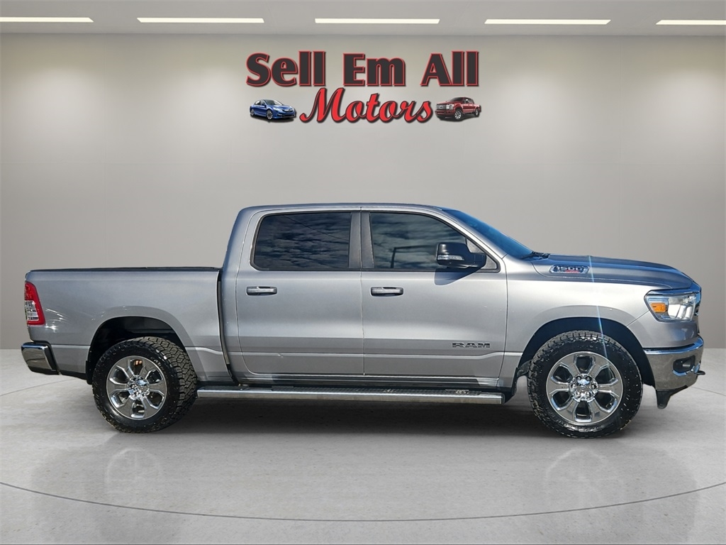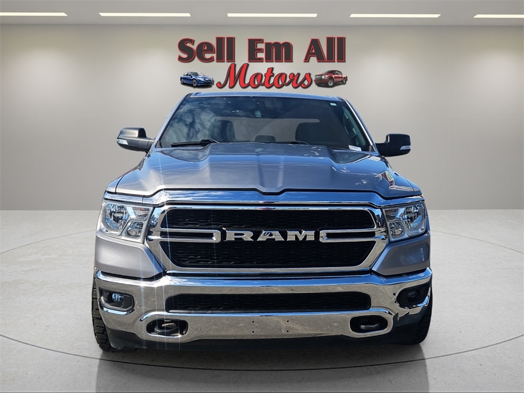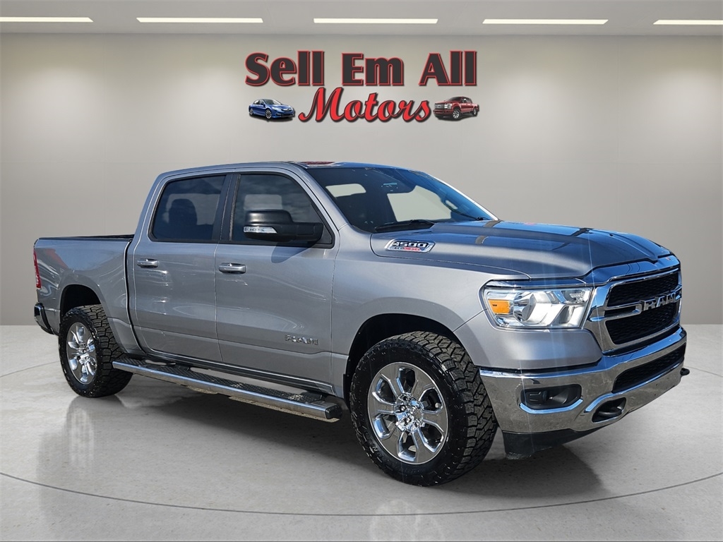 Sell Em All Motors in Vidlia is very proud to offer this handsome 2021 Ram 1500 in Billet Silver Metallic Clearcoat This vehicle has passed our comprehensive inspection and comes with the following Big Horn Level 1 Equipment Group (Class IV Receiver Hitch and Radio: Uconnect 4 w/8.4" Display), Protection Group (Tow Hooks), Quick Order Package 28Z Big Horn, Trailer Tow Group (Add Class IV Receiver Hitch, Trailer Brake Control, Trailer Light Check, and Trailer Tire Pressure Monitoring System), 3 Rear Seat Head Restraints, 4 Way Front Headrests, 4-Wheel Disc Brakes, 40/20/40 Split Bench Seat, 48V Belt Starter Generator, 6 Speakers, ABS brakes, Air Conditioning, Alloy wheels, AM/FM radio, Anti-Spin Differential Rear Axle, Black Exterior Mirrors, Brake assist, Bumpers: chrome, Cloth Bench Seat, Compass, Delay-off headlights, Driver door bin, Dual front impact airbags, Dual front side impact airbags, Electronic Stability Control, Front anti-roll bar, Front Center Armrest w/Storage, Front fog lights, Front reading lights, Front Seat Back Map Pockets, Front wheel independent suspension, Fully automatic headlights, GPS Antenna Input, Heated door mirrors, Illuminated entry, Integrated Voice Command w/Bluetooth, Leather steering wheel, Low tire pressure warning, MOPAR Front & Rear Rubber Floor Mats, Occupant sensing airbag, Outside temperature display, Overhead airbag, Overhead console, Panic alarm, ParkView Rear Back-Up Camera, Passenger door bin, Passenger vanity mirror, Power door mirrors, Power steering, Power windows, Radio data system, Radio: Uconnect 3 w/5" Display, Rear 60/40 Folding Seat, Rear anti-roll bar, Rear seat center armrest, Rear step bumper, Remote keyless entry, Speed control, Split folding rear seat, Steering wheel mounted audio controls, Tachometer, Telescoping steering wheel, Tilt steering wheel, Traction control, Trip computer, Variably intermittent wipers, Voltmeter, Wheels: 18" x 8" Cast-Aluminum Painted, and Wheels: 20" x 9" Aluminum Chrome Clad;